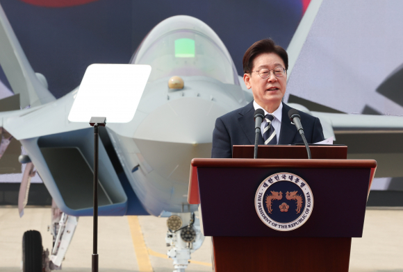 이 대통령은 이날 오후 경남 사천에서 열린 KF-21 양산 1호기 출고식에 참석해 이같이 말했다.