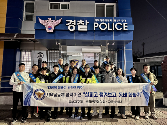 | 5대 범죄 핫스팟 중심 치안 활동 모습.<영주서 제공> | 영주경찰서가 지난 25일부터 범죄 발생이 집중되는 지역을 중심으로 예방 활동을 강화하는 '5대 범죄 핫스팟 중심 치안 활동 전략'을 추진하고 있다. 범죄 및 치안 환경 분석 결과 범죄가 특정 지역에 집중되는 핫스팟 현상이 확인돼 시민 체감 불안 요인 해소를 위한 범죄 취약지 중심 예방‧순찰‧환경개선 등 종합적인 치안 활동을 추진할 계획이다. 특히 동부지구대에서는 지난 26일 관내 범죄 취약지역 및 상가 밀집지역을 중심으로 경찰, 생활안전협의회, 자율 방범대 등이 참여하는 '살피고, 챙겨보며 동네 한바퀴' 민·경 합동 순찰을 실시했다. 최진육 경찰서장은 “범죄 발생 이후 대응하는 치안에서 벗어나 범죄가 발생하기 전에 예방하는 치안 활동을 강화하고, 순찰‧환경개선‧주민 협력 치안을 병행해 시민이 체감할 수 있는 안전한 지역사회를 만들겠다”고 밝혔다. |