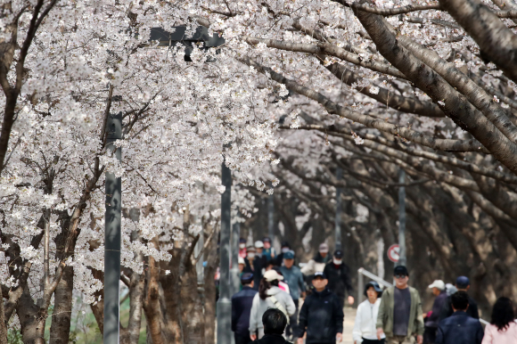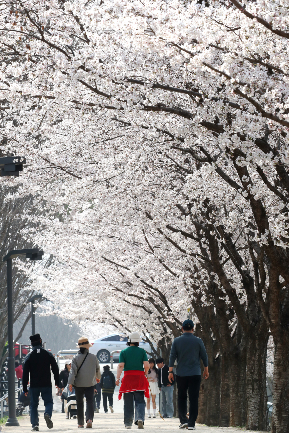 29일 휴일을 맞아 대구 동구 금호강 동촌유원지 벚나무길을 찾은 시민이 활짝 핀 벚꽃 사이를 산책하고 있다.뉴스1 |