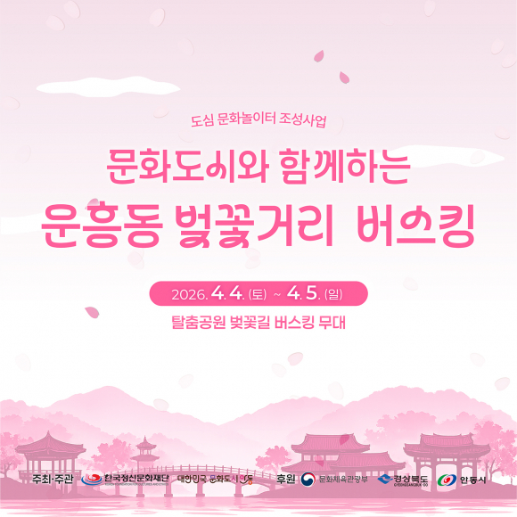 이번 프로그램은 제64회 경북도민체육대회의 성공적 개최를 기원하고 도심 내 유휴공간을 맞춤형 문화향유공간으로 조성하는 것이 특징이다. 특히 벚꽃 개화 시기에 맞춰 오는 4월 1일~5일까지 안동 도심 곳곳에서 계절 특화 거리 공연인 ‘벚꽃 버스킹’을 선보일 예정이다.