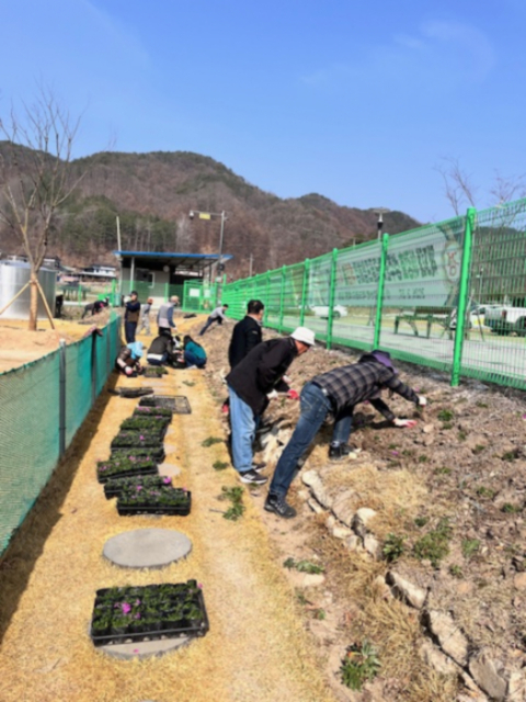 성주 금수강산면이 지난 28일, 파크골프장 진입로와 시설 외곽 경계를 따라 비어있던 유휴지에 꽃잔디를 집중 식재했다.