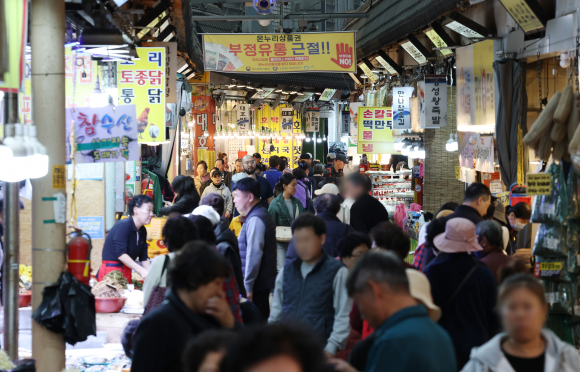 정부가 중동 정세 장기화에 따른 고유가 부담 완화를 위해 총 26조 2000억 원 규모 추가경정예산안(추경)을 편성하고, 소득 하위 70% 국민 약 3580만 명에게 1인당 10만~60만 원의 피해지원금을 지역화폐 형태로 지급하기로 했다. 사진은 31일 경기 수원 팔달구 못골시장에 시민이 장을 보고 있는 모습.뉴스1