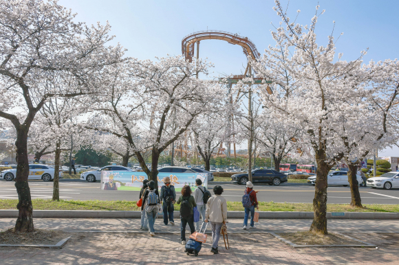 ↑↑ 경주월드 인근 벚꽃길에서 관광객들이 만개한 벚꽃 아래를 걸으며 봄 나들이를 즐기고 있다.<경주시 제공>