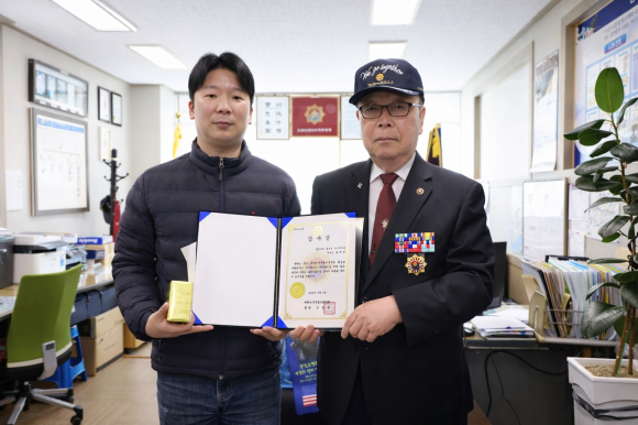 ↑↑ 지난 3일 경주시보훈회관에서 최재석 주무관(왼쪽)이 윤정대 대한민국무공수훈자회 경북지부 경주시지회장으로부터 감사장을 받은 뒤 기념촬영을 하고 있다.<경주시 제공>