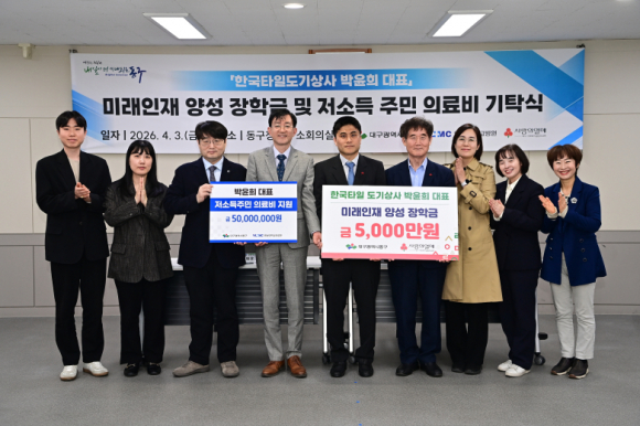 대구 동구에 한국타일도기상사 박윤희 대표가 지난 3일 대구 동구청을 방문해 인재 양성과 의료 사각지대 해소를 위한 성금 1억 원을 기탁했다.