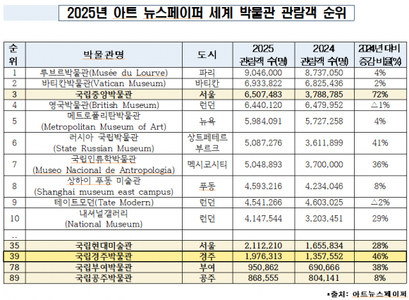 ↑↑ 2025년 아트 뉴스페이퍼 세계 박물관 관람객 순위-출처: 아트뉴스페이퍼<국립경주박물관 제공>