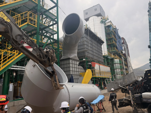 ↑↑ 경주 외동읍 제내리 소각로 배관 설치 공사현장-바스켓에 부딪히며 탑승 작업자 3명이 4m 지상으로 떨어진 사고 현장<경북소방청 제공>