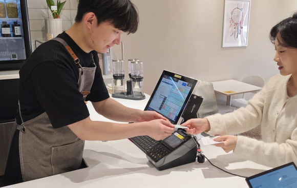 ↑↑ 대구 달성군의 한 카페에서 고객이 음료를 주문하며 카드로 비용을 치르고 있다. 달성군 제공