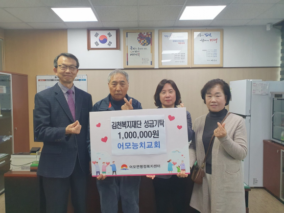 김천 어모 능치교회가 9일 면 행정복지센터를 방문해 성금 100만 원을 김천복지재단에 기탁했다.