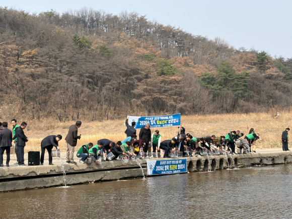 | ↑↑ 영덕 지역 특산물인 황금 은어를 보존하기 위해 지난 3월 어린 개체를 방류하고 있다.<영덕군 제공> |