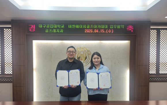 대구공업대(총장 이별나) 골프레저과가 지난 15일 골프 전문 교육 및 트레이닝 기관인 비앤에이치골프아카데미와 산학협력 강화를 위한 업무협약(MOU)을 체결했다.