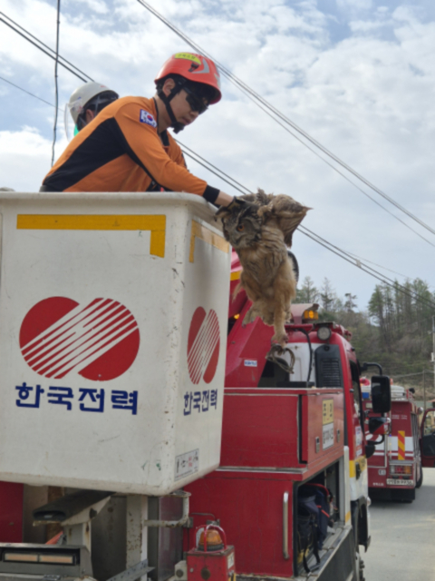 | ↑↑ 수리부엉이 구조 모습.<봉화소방 제공> |