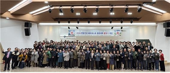 | ↑↑ 대구한의대학교 대강당에서 열린 '2026 한방건강 해피네스트 행복한 청춘대학' 개강식에서 참석자들이 기념촬영을 하고 있다. 대구한의대 제공 |
