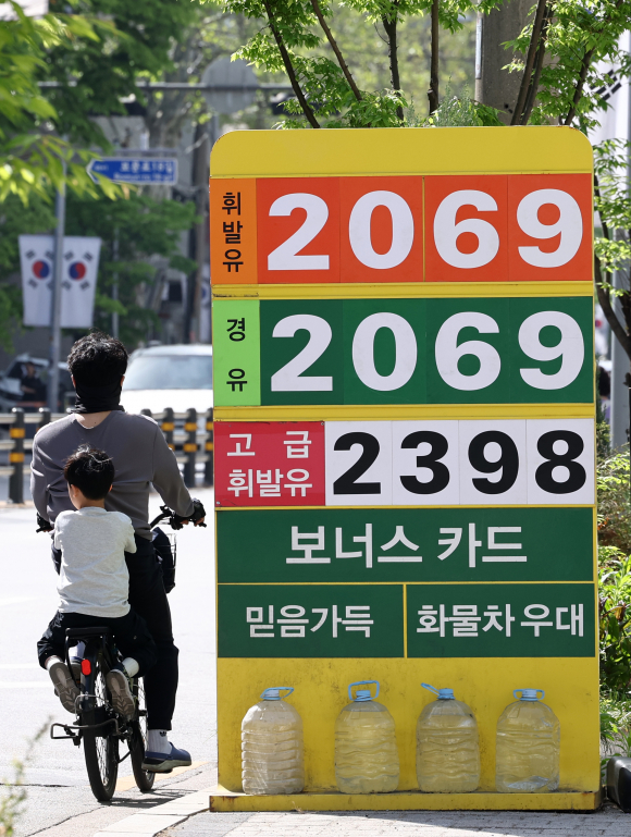 전국 평균 휘발유 가격이 리터당 2000원을 넘어선 가운데 19일 서울의 한 주유소에 유가 정보가 표시돼 있다. 한국석유공사 유가정보시스템 오피넷에 따르면 19일 오전 9시 기준 휘발유 전국 평균 가격은 전날비 0.42원 상승한 리터당 2001.93원, 경유 평균 가격은 전날비 0.35원 상승한 리터당 1995.62원을 기록하고 있다.뉴스1