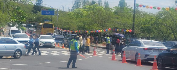 | ↑↑ 지난 18일, 불국사 공영주차장 들어가는 입구에 교통행정과 직원 및 교통자원봉사자들이 차량 통제 및 이동을 지원하고 있다.<김경태 기자> |