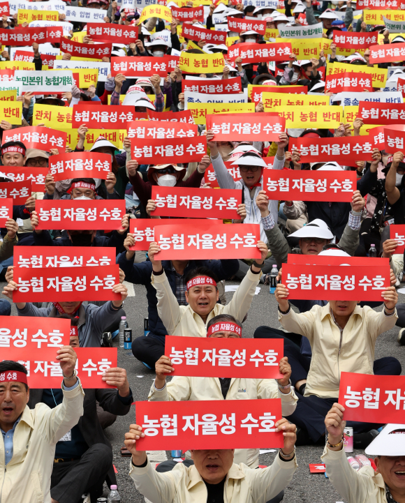 21일 오후 서울 영등포구 여의대로 일대에서 열린 농협 자율성 수호 농민 결의대회에서 조합원들이 구호를 외치고 있다.뉴스1