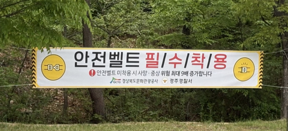 ↑↑ ‘안전벨트 필수착용’ 홍보 현수막이 부착된 모습<경주경찰서 제공>