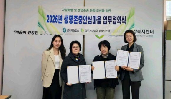 | 경주정신건강복지센터가 지난 23일 현곡면 금장주공 경로당, 삼성아파트 경로당과 ‘생명존중안심마을’조성을 위한 업무협약을 체결했다. 협약은 지역사회 중심 자살 예방 안전망을 강화하고, 생명존중 문화를 확산하기 위해 마련됐다.