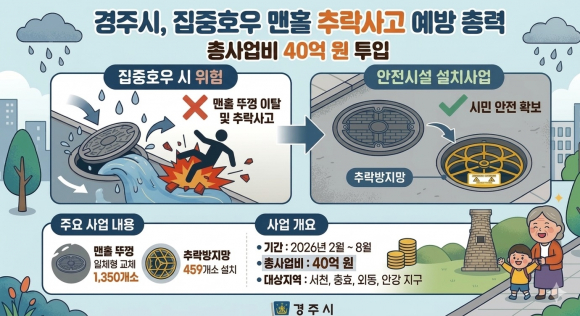 | 경주시가 집중호우에 따른 맨홀 추락사고를 예방하기 위해 침수 우려 지역을 중심으로 안전시설 설치사업을 추진한다.