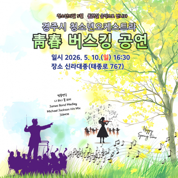 김유경 경주 아동청소년과장은 “공연은 청소년 단원이 꾸준히 준비해 온 연주를 시민과 관광객에게 선보이는 자리”라며 “봄날 야외에서 펼쳐지는 청소년오케스트라 버스킹 공연에 많은 관심과 참여를 부탁드린다”고 말했다.