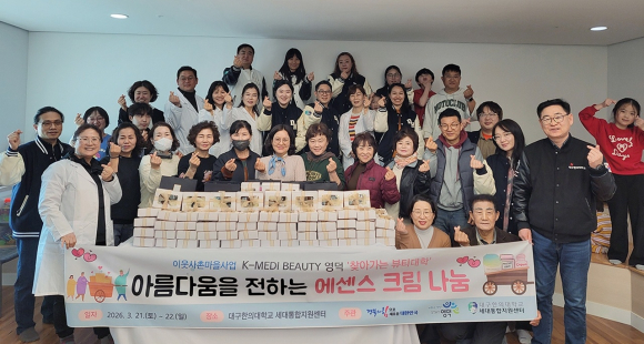 대구한의대 세대통합지원센터와 향장산업학과가 최근 영덕 지역에서 '찾아가는 뷰티대학 프로그램'을 운영하고, 에센스 크림 세트 100개를 제작해 주민에게 기부하는 나눔 활동을 펼쳤다.
