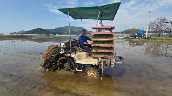 상주내 올해 첫 모내기가 지난 27일 모서면 도안리 농가 답에서 ‘미소 진품’품종을 이앙했다.