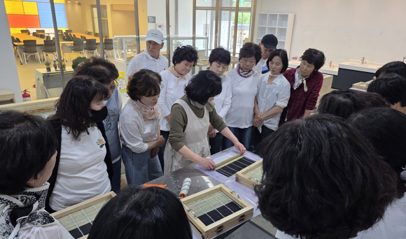 ‘1학기 현장교육’이 진행되고 있다-한지뜨기체험.<영주시 제공>