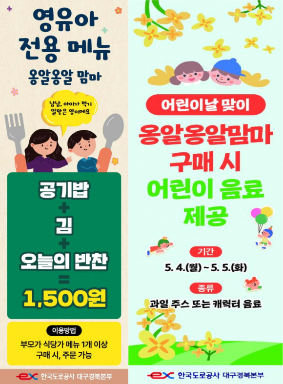 어린 자녀를 동반한 이용객 편의를 위해 영유아 전용 메뉴 ‘옹알옹알 맘마’를 1500원에 상시 판매한다. 해당 메뉴는 밥과 김, 계란후라이 또는 짜장 등 아이들이 선호하는 반찬 1종으로 구성됐다.