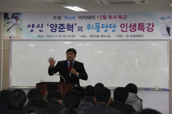 수성대학교(총장 김선순)가 지역 벤처기업과 손잡고 지역 기업인들과 예비창업자, 취업준비생 등의 네트워킹과 인문학적 소양 강화를 위한 지식 공감 나눔 토크쇼인 ‘대문열기(대한민국의 문제를 열기)’프로젝트를 1년 동안 실시한다. 이 프로젝트는 전 삼성라이온즈야구단의 전설인 양준혁 MBC야구해설위원, 대구시 김연창 경제부시장, 대구과학관 김덕규 전 관장, 카카오페이 류영준 대표 등을 강사로 초청, 인기 방송인의 사회로 모두 6회에 걸쳐 다양한 주제로 토크쇼를 개최한다. 첫 번째 행사는 야구해설가인 양준혁씨와 한국야구위원회 김재박 위원이 패널로 나서 '야구현장에 이뤄지는 경쟁과 발전'을 주제로 다양한 이야기를 풀어 헤치고, 참석한 관객들과 상호 공감할 수 토크쇼를 진행할 예정이다. 1회차 토크쇼는 오는 18일 오후7시 수성대 젬마관 세미나실(문의 수성대 산학협력단 053-749~7016)에서 개최된다. 토크쇼 참석은 누구나 가능하며, 선착순 200명 현장접수 한다. 다음 달 실시 예정인 2회차 행사는 대구시 김연창 경제부시장이 나서 4차산업혁명과 세계경제 변화를 주제로, 6월에 개최될 3회 토크쇼는 대구과학관 김덕규 전 관장과 대구교육대 권택환 교수가 나선다. 올 하반기에는 행정안전부 김부겸 장관이, 카카오페이 류영준 대표가 토크쇼의 주인공으로 나서기로 하는 등 지역 유력인사들이 다양한 주제로 관객들과 미래사회에 필요한 사회적 지식 가치를 공유한다. 이 행사는 CJ헬로를 통해 방송되고, 수성대 페이스북을 통해서 현장 생중계할 예정이다. 이 프로젝트는 지역의 대표적인 건설IT분야 벤처기업 ㈜군월드(대표이사 이동군·대구시 수성구 알파시티1로)가 ‘사회적 가치 나눔을 위한 지식공유 사업’의 일환으로 수성대와 손을 잡고 진행하는 행사다. ㈜군월드는 빅데이터 등을 활용 건설분야 첨단 IT기술력을 적용해 건설IT개발사업, 건설PM사업은 물론 지식공유사업과 창업지원컨설팅을 통한 미래전략사업에도 주력하고 있는 기업으로, 최근 수성대에 발전기금 1천만원을 기부했다. 산학협력단 김건우 단장은 “지역의 대표적인 건설IT 벤처기업과 손잡고 지역민들과 사회적 가치를 공유하고 서로 생각을 나누는 의미 있는 행사를 갖게 됐다 며 우리 대학은 지역사회와 공감하면서 4차산업혁명 중심의 대학 역량 강화를 위해 더욱 노력할 계획"이라고 말했다. 한편 수성대는 학생, 교직원은 물론 시민들의 인문학적 소양을 넓혀주기 위해 유시민 작가 등 인기 작가들을 초청, 지난 2012년부터 ‘수성대 북아카데미’를 개최하는 등 지역 사회를 위한 다양한 교육기부를 펼쳐왔다. 김만영 기자 kegis1@naver.com ▲ 수성대가 시민, 학생들을 대상으로 인문학적 소양을 키우기 위해 유시민 작가 등 인기 작가들을 초청 실시한‘수성대 북아카데미’에서 `양준혁의 위풍당당 인생특강’을 주제로 특강하고 있는 양준혁 MBC야구해설위원. |