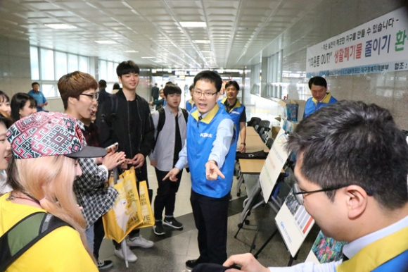 코레일 대구본부는 최근 재활용 폐기물 처리문제가 사회적 이슈로 대두됨에 따라, 2일 동대구역 맞이방에서 한국환경공단 대구경북지역본부와 함께 생활 폐기물 줄이기 환경캠페인을 시행했다.