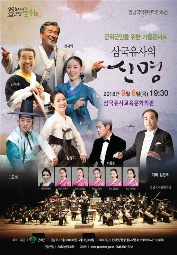 군위군은 9월 군위군민을 위한 가을콘서트 삼국유사의 신명을 오는 6일 저녁 7시 30분 공연한다. 군위 군민을 위한 가을테마 공연으로 영남국악관현악단과 우리시대 최고의 소리꾼 장사익, 대한민국 사물놀이 대중화와 전통문화를 전수하는 대표적인 예인 김덕수, 경기민요 이수자 고금성과 김경기외5명, 최근 불후의 명곡에 출연하여 아내인 국악인 김나니와 콜라보 무대를 꾸며 우승을 차지한 현대무용가 정석순을 비롯 군위출신 성악가 서동희 등으로 구성하여 TBC 문채희 아나운서의 진행으로 지역 문예회관 활성화 및 대중성을 고려한 퓨전 공연을 선보인다. 관람료는 1층은 20,000원 2층은 16,000원이며 공연에 대한 자세한 내용은 삼국유사교육문화회관 홈페이지 또는 전화로 문의하면 된다. 군위=조헌국 기자 wh3100@naver.com |
