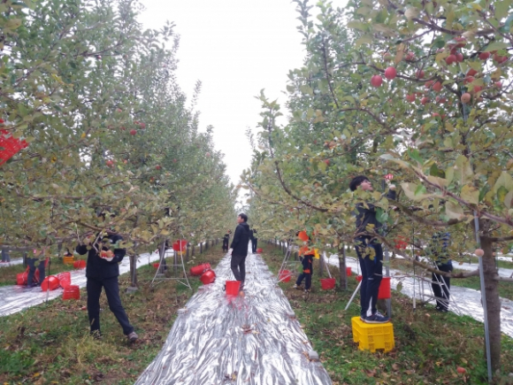 의성군 안전과와 금성면사무소 직원 35명은 지난 26일 의성군 금성면 청로리 소재 1,500여 평의 사과 밭에서 사과 따기 작업을 했다