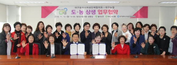 대구농협이 대구시여성단체협의회와 달성군청 8층 상황실에서 상호협력과 교류를 위한 업무협약을 체결하고 있다. 농협대구지역본부 제공