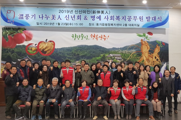 영주시 풍기읍지역사회보장협의체는 지난 23일 풍기읍사무소 회의실에서 57명 명예사회복지공무원이 참석한 가운데 ‘2019풍기 나누신년회와 함께 풍기읍 명예사회복지 공무원 발대식을 가졌다.
