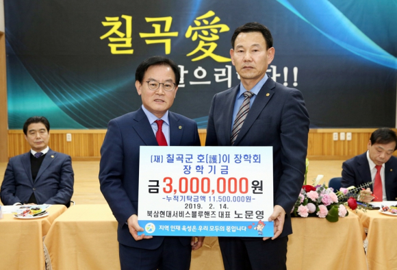 북삼현대서비스블루핸즈(대표 노문영)은 지난 14일 지역인재육성과 교육발전을 위해 써달라며 호이장학금 3백만 원을 (재)칠곡군호이장학회(이사장 백선기)에 기탁했다.