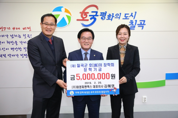 ㈜태영피앤엑스(대표이사 김혜영)은 20일 지역인재육성과 교육발전을 위해 써달라며 호이장학금 5백만 원을 (재)칠곡군호이장학회(이사장 백선기)에 기탁했다.