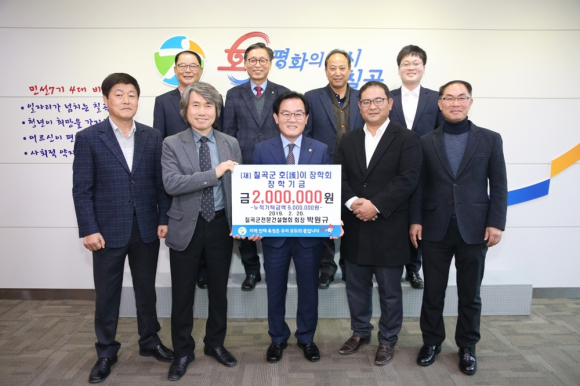 칠곡군전문건설협회(회장 박원규)는 20일 지역인재육성과 교육발전을 위해 써달라며 호이장학금 2백만 원을 (재)칠곡군호이장학회(이사장 백선기)에 기탁했다.