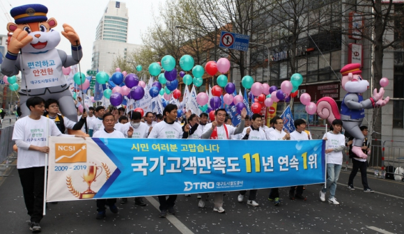 홍승활 대구도시철도공사장을 비롯한 임직원이 7일 열린 '2019 대구국제마라톤 대회'에 단체로 참가해 시민들과 함께 건강 마라톤을 즐기고 있다. 대구도시철도공사 제공