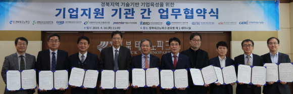(재)경북테크노파크가 지난 16일 경북바이오산업연구원, 경북해양바이오산업연구원, 경북하이브리드부품연구원, 포항금속소재산업진흥원, 한국로봇융합연구원, 경북차량용임베디드기술연구원, 경북IT융합산업기술원, 한국섬유기계융합연구원, 구미전자정보기술원과 공동으로 지역기업의 기술개발과 기술사업화 촉진을 위한 업무협약을 맺었다고 밝혔다.