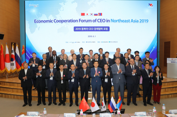 지난 1일 포스코 국제관에서 열린 2019 동북아CEO경제협력포럼에서 참석자들이 기념촬영을 하고 있다.