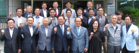 김부겸 더불어민주당 국회의원, 윤진필 경산산업단지관리공단 이사장, 양재영·남광락 경산시의원과 안영수 경산시 경제환경국장, 산업단지 기업체 대표 등이 ‘간담회’를 열고 기년촬영을 하고 있다. 경산산업단지관리공단 제공
