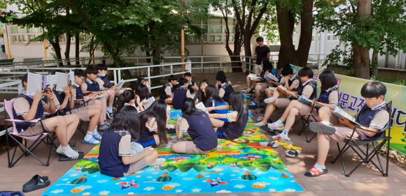 장산중학교 학생들이 점심시간을 이용해 상수리나무 아래서 서울대 선정 인문고전 읽기 프로젝트에 참여하고 있다. 경산교육청 제공