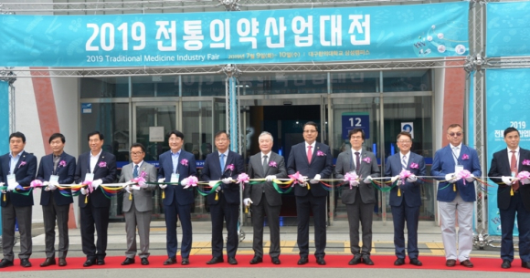 한국한의약진흥원이 지난 9~10일 대구한의대학교 삼성캠퍼스 한의학관에서 ‘2019 전통의약산업대전 커팅식을 하고 있다. 한국한의약진흥원 제공