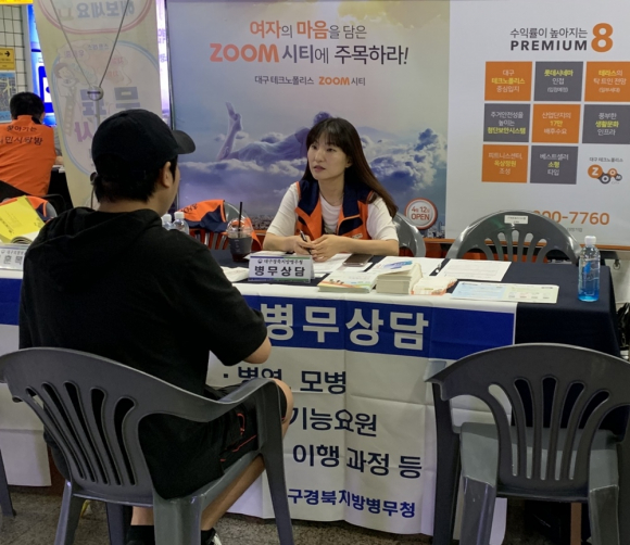 대구경북지방병무청이 10일 대구 지하철 1호선 영대병원역사에 마련된 ‘시민사랑방’에서 찾아가는 병역이행 맞춤 상담과 병무행정 홍보 활동을 벌이고 있다. 대구경북지방병무청 제공