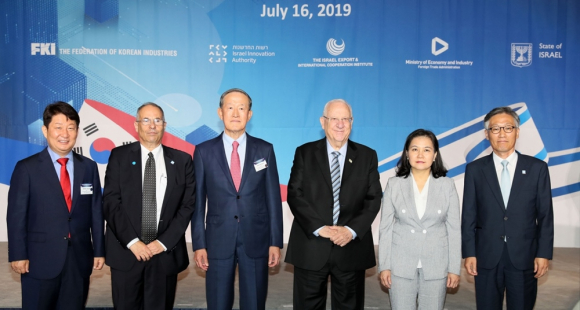 권영진 대구시장, 하임 호센 주한이스라엘대사, 허창수 전경련 회장, 레우벤 리블린 이스라엘 대통령, 유명희 산업통상자원부 통상교섭본부장, 최용환 주이스라엘 대사가 협약 이후 기념사진을 찍고 있다. 대구시 제공