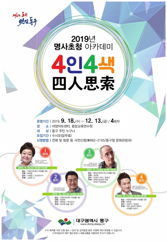 동구는 9월부터 12월까지 아양아트센터 및 혁신도시 내 중앙교육연수원에서 매월 1회 '명사초청아카데미 4인4색(四人思索)'특강을 연다.