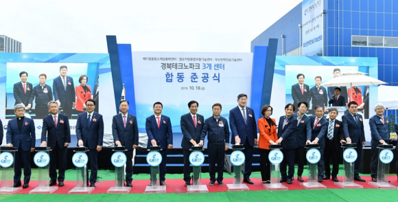 경북도와 경산시, 경북테크노파크(경북TP)는 지난 18일 경산 하양읍 경산지식산업지구 내 경북테크노파크 2단지에서 '메디컬융합소재실용화센터(총사업비 450억원)', '철도차량융합부품기술센터(200억원)', ‘무선전력전송기술센터(192억원)’ 3개 연구기관 합동준공식을 갖고 4차 산업혁명을 선도할 새로운 연구 센터의 개막을 알리고 본격 운영에 들어갔다.