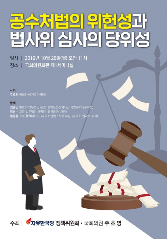 자유한국당 주호영 의원(4선, 대구 수성구을)은 28일 국회의원회관 제1세미나실에서 자유한국당 정책위원회와 공동으로 ‘공수처법의 위헌성과 법사위 심사의 당위성에 관한 토론회’를 열었다.