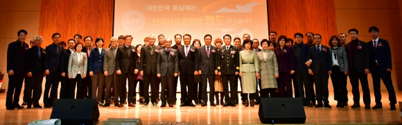 이승율 청도군수와 박기호 청도군의장과 군의원, 이승목 경찰서장, 김금주 청도교육장, 기관·단체장, 회원 등이 한국자유총연맹 청도군지회 '2019 사업평가·한마음전진대회'가 열리고 있다. 청도군 제공