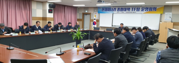 청도군농업기술센터 세미나실에서 청도군 관계자들이 참석한 가운데 한재미나리 T/F팀 운영회의가 열리고 있다. 청도군 제공